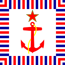 The flag of the Commander of the Navy (Zastava komandanta ratne mornarice) was a square white flag with a border made of tricolour bars, and a red anchor fouled with a yellow cable surmounted with the yellow bordered red five-pointed star.
