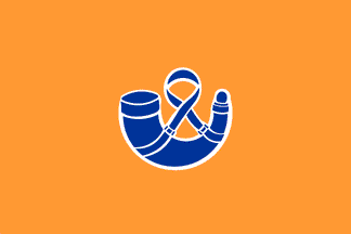 The National Party (NP) was the ruling party in South Africa from 1948 until 26 April 1994 when the ANC came to power.  The NP was formed in 1912 and was committed to the defence of Afrikaner interests, the abandonment of South Africa's ties with Britain and pursuing a policy of "separate development" between the races - later institutionalized as apartheid.  According to Philip Rault's paper on Afrikaner Political Flags presented at the XVII International Congress of Vexillology in Cape Town (1997), the NP initially had no particular emblem or flag.  A flag using the then national colours was finally adopted in 1939 comprising a blue gunpowder horn, fimbriated in white, in the centre of an orange field. In 1937 orange was adopted as the official party colour.