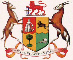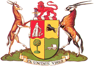 "Quarterly per fesse wavy First Quarter Gules a female figure representing Hope resting the dexter arm upon a rock and supporting with the sinister hand an Anchor Argent Second Quarter Or two Wildebeesten in full course at random both proper Third Quarter Or upon an island an Orange tree Vert fructed proper Fourth Quarter Vert a Trek Waggon Argent And for the Crest On a Wreath of the Colours A Lion passant guardant Gules supporting with the dexter paw four staves erect alternately Argent and Azure and branded Or And for the Supporters, On the dexter side A Spring Buck and on the sinister side An Oryx (Gemsbuck) both proper together with the motto EX UNITATE VIRES"