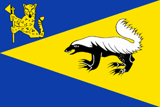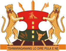 pile reversed charged with a ratel statant proper, in the canton a demi-leopard gardant also proper, holding in its forepaws a gold Tswana