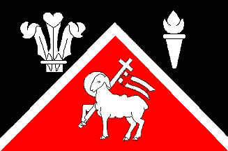 the width of the flag. There is a plume of three ostrich feathers bound in the