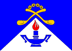 The flag of the Gazankulu College of Nursing (located in the former Gazankulu Homeland in what is now Limpopo Province) is in the proportion of 2:3, is divided per upright chevron, blue and white. The blue is charged centrally with two spoons in saltire, handles upwards and joined by a chain, embowed, all in gold. On the white appears a double-handled candlestick and candle, both in blue, with the candle enflamed in red. This flag is a heraldic banner of the Coat-of-Arms registered by the Bureau of Heraldry for the Gazankulu College of Nursing under certificate number 2088 dated 09 August 1989.