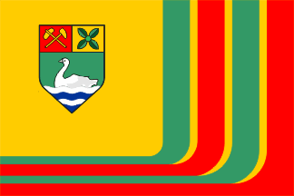 The flag of Roodepoort, adopted during its Diamond Jubilee celebrations in 1963, was in the predominant colours of its municipal arms and had the shield in the canton. The remainder of the flag comprised four alternating “L” shaped bands in the fly of green and red fimbriated in yellow in the fly and uniting without the fimbriation at the bottom of the flag.