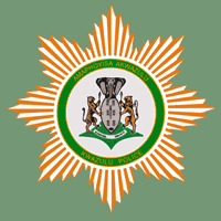 The flag of the KwaZulu Prisons Service (whose name was later changed to the KwaZulu Correctional Services) has a dark green field with the second KwaZulu flag in the canton, occupying one quarter the length of the field with the badge of the KwaZulu Prisons Service in gold, with black detail, in the lower fly. The flag was designed by the South African Bureau of Heraldry and the badge was registered under the Heraldry Act in April 1991. The badge consists of a gourd charged with a representation of the ground plan of a cattle kraal, with an inner kraal, above which are three Zulu huts; the gourd resting on a grass mat, all within and conjoined to two feathers tied together to form an open wreath.